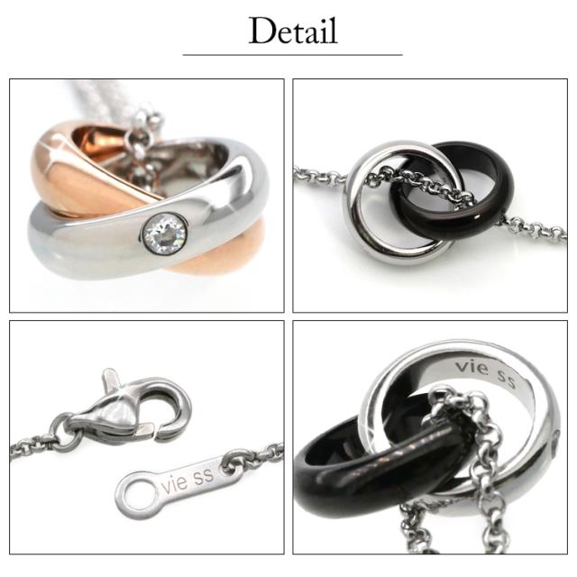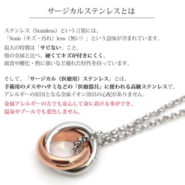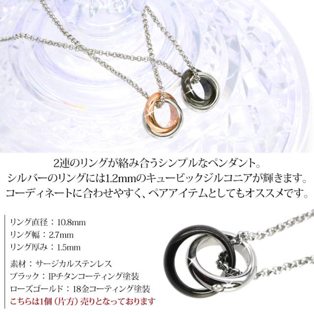 2連のリングが絡み合うシンプルなペンダント。 シルバーのリングには1.2mmのキュービックジルコニアが輝きます。 コーディネートに合わせやすく、ペアアイテムとしてもオススメです。 着けっぱなしにしていたり汗をかいても痒くならない、サージカルステンレス製だから 金属アレルギーの方にも安心してご使用いただけます。 温泉や海で変色する心配もないので、どこへ行く時もいつも着けていられます。 ネックレスチェーンはデザインにあわせカット小豆チェーンを使用しております。