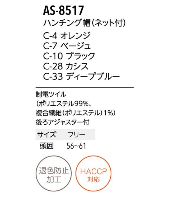 飲食サービス系ユニフォーム アルベ arbe チトセ chitose 兼用 ハンチング帽(ネット付) AS-8517 通年