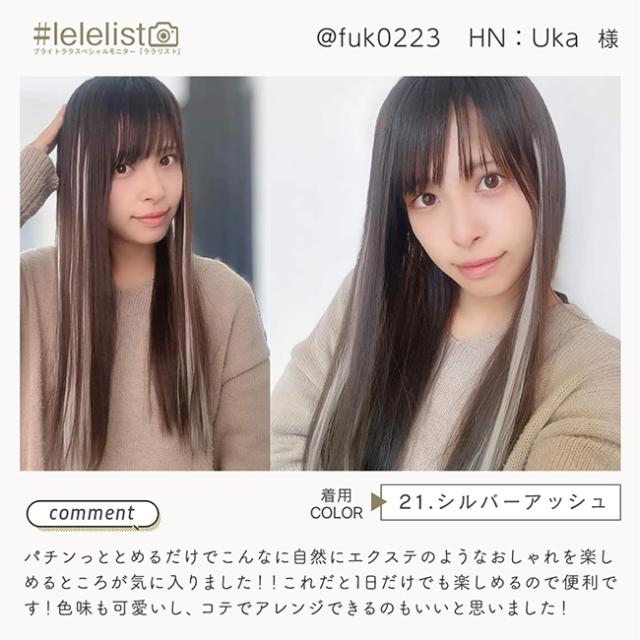- 色が写真と全く一緒で髪にも違和感なく馴染んでとてもいいと思います。 毛が抜けやすいので注意です。。