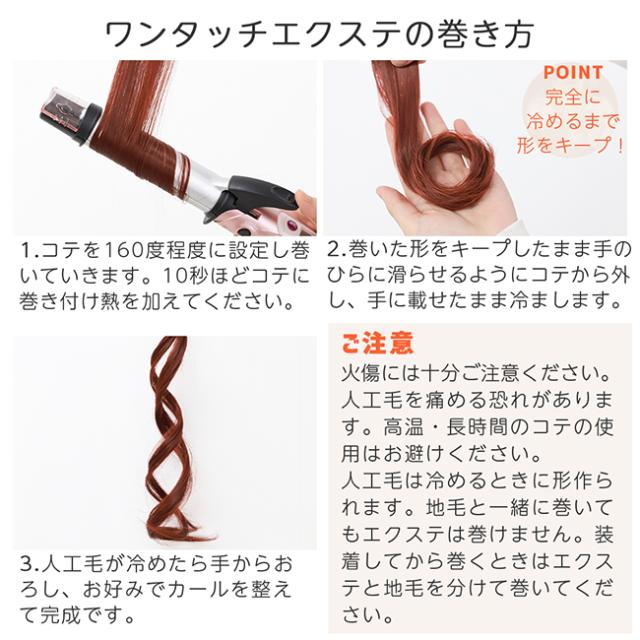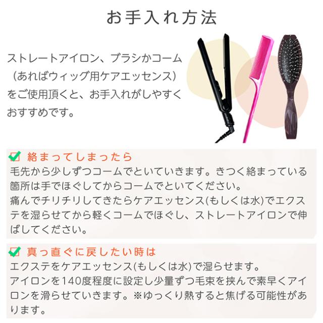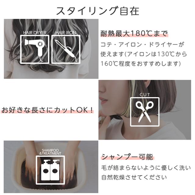| その他 | 金属使用 シャンプー可能 ドライヤー、コテ、アイロン等で好みの髪型に整えることができます。 (耐熱最大温度180度まで) |
