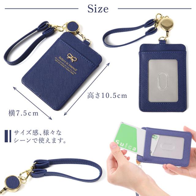 かわいいリボンチャームが付いた、リール付きパスケース。 リール付きで使い勝手GOOD! 鞄に付けたままタッチできるとっても便利なパスケースです。 裏面には、メインのカードの他にも数枚収納できるオープンポケットが付いています。 カラーは6色。 キュートなカラーとリボンチャームがポイントの人気パスケースです。 金具は主にゴールドカラーを使いキュートな仕上がり。 ●サイズ: 本体 約10.5×7.5cm | |