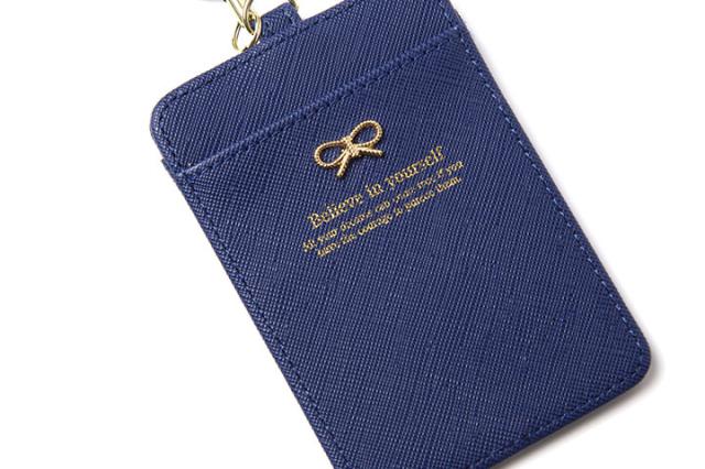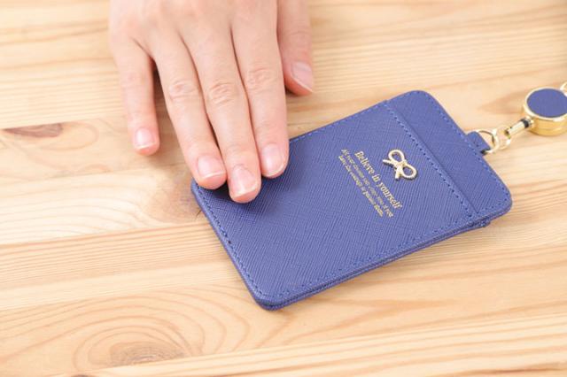 かわいいリボンチャームが付いた、リール付きパスケース。