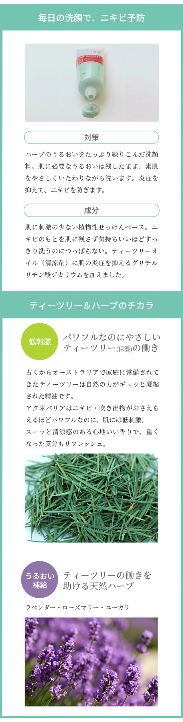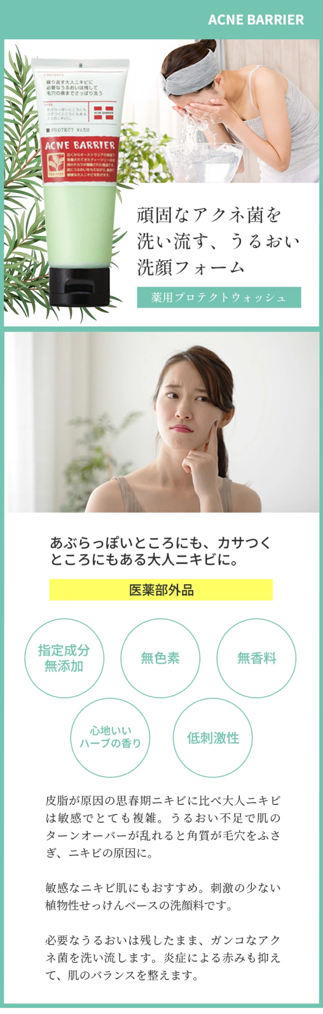 皮脂が原因の思春期ニキビに比べ大人ニキビは敏感でとても複雑。うるおい不足で肌のターンオーバーが乱れると角質が毛穴をふさぎ、ニキビの原因に。敏感なニキビ肌にもおすすめ。刺激の少ない植物性せっけんベースの洗顔料です。 |