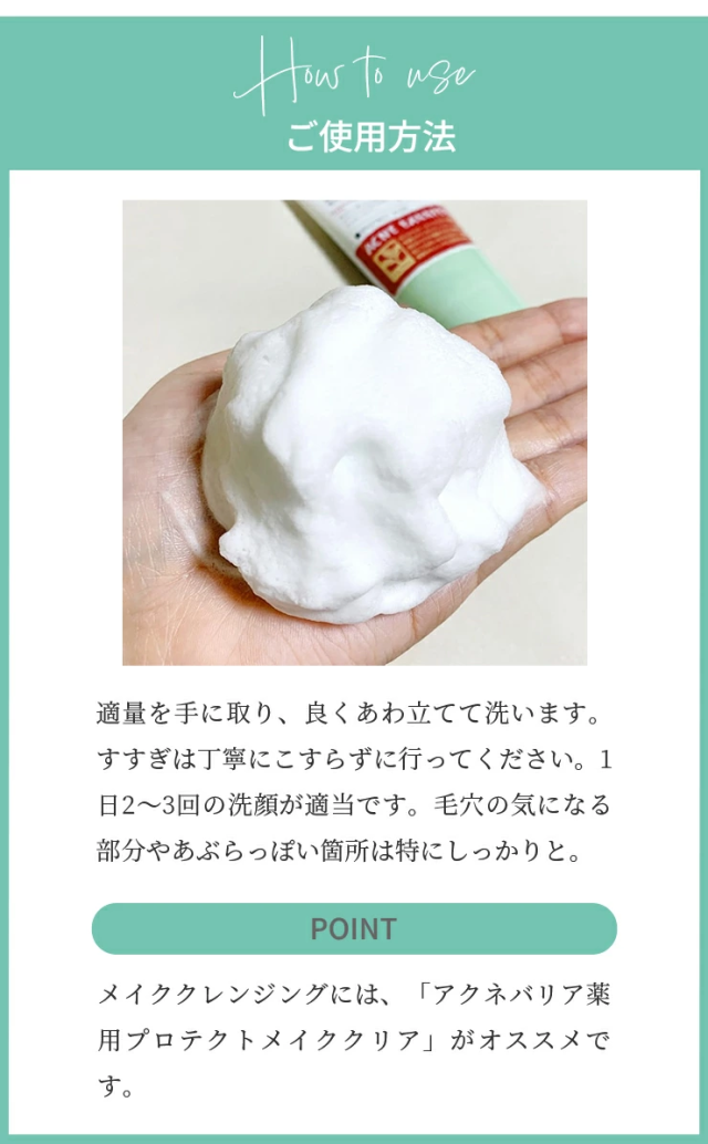 適量を手に取り、良く泡立てて洗います。すすぎは丁寧にこすらずに行ってください。1日2〜3回の洗顔が適当です。毛穴の気になる部分やあぶらっぽい箇所は特にしっかりと。 |