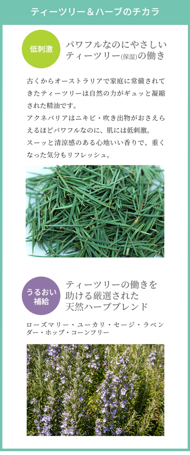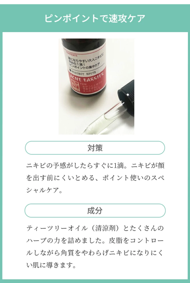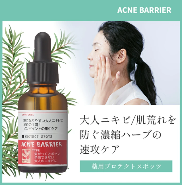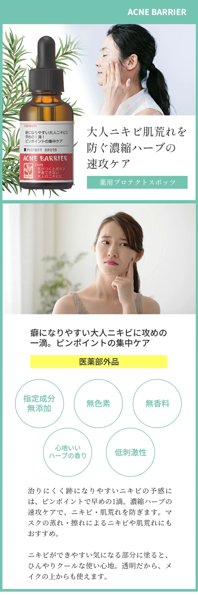 治りにくく跡になりやすいニキビの予感には、ピンポイントで早めの1滴。濃縮ハーブの速攻ケアで、ニキビ・肌荒れを防ぎます。マスクの蒸れ・擦れによるニキビや肌荒れにもおすすめ。 |