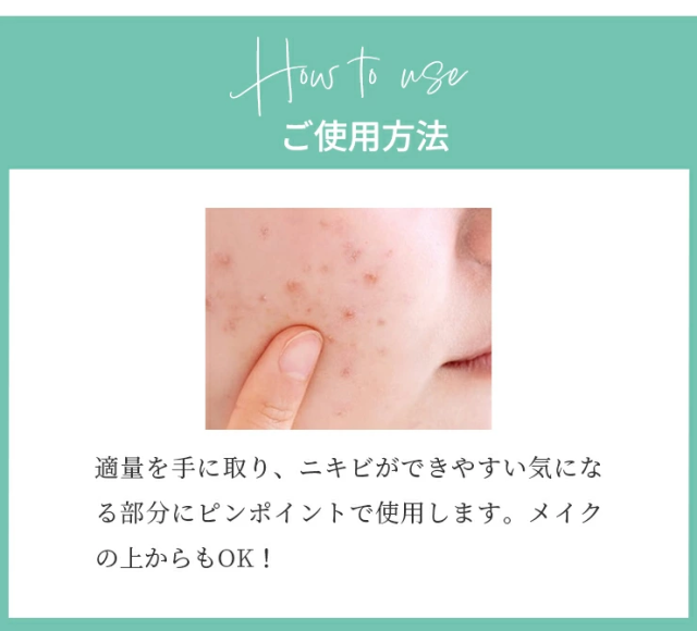 適量を手に取り、ニキビができやすい気になる部分にピンポイントで使用します。メイクの上からもOK! |
