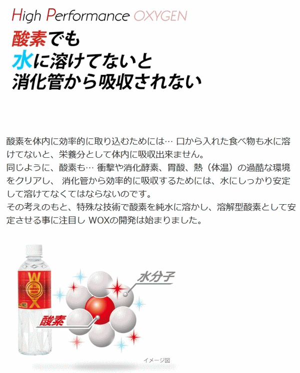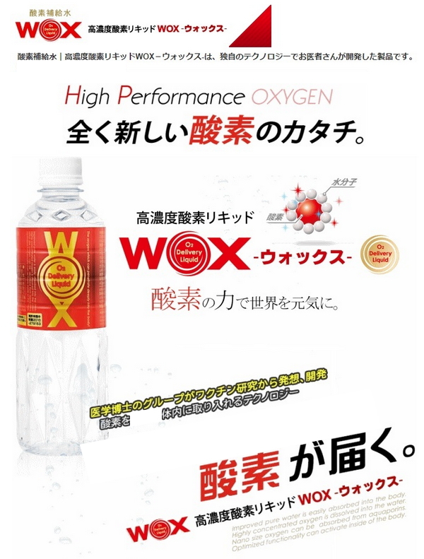 スポーツ選手やアスリートに人気の高濃度酸素リキッドWOX(ウォックス)。WOXは身体に吸水されやすい水に酸素を高濃度に溶かし込んでいます。そのため、水と一緒に身体の中へ酸素が届けられます。独自開発により小さいクラスターとなった水に溶けた酸素が、水と一緒に体内にしみこみます。成分は水と酸素だけでカロリーゼロですので安心してお飲み頂けます。