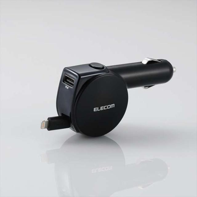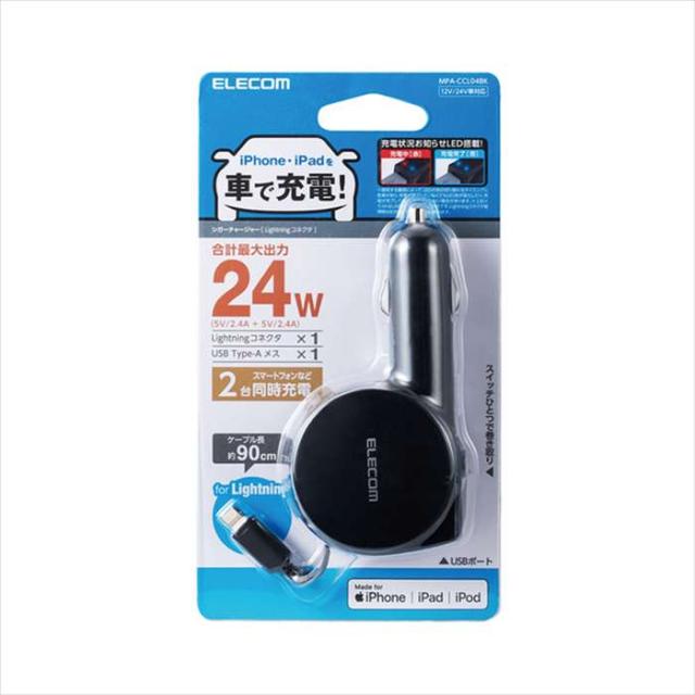 代引不可 iPhone/iPad/iPod 4.8A 巻取りDC充電器 Lightningコネクタ ケーブル長90cm ブラック エレコム MPA-CCL04BK