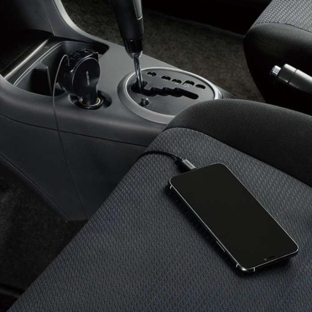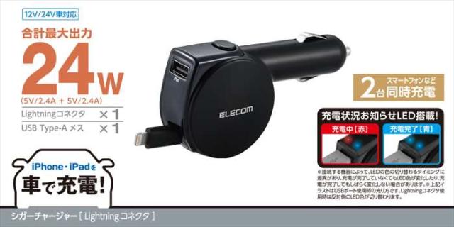 自動車のアクセサリソケットからLightningコネクタまたはUSBポートを介してiPhoneやスマートフォン、iPadやタブレットを充電できる車載充電器です。合計最大出力24W(5V/4.8A)で、iPhoneやスマートフォン、iPadやタブレットなどの2台同時充電が可能です。※Lightningケーブル、USBポートはそれぞれ最大出力12W(5V/2.4A)約90cmの巻き取り式ケーブルで取り回しがしやすく、すっきりと収納できます。12V/24V入力に対応し、普通車はもちろん、トラックなどの大型車でもご使用になれます。充電状況がすぐ見えるインジケーターを搭載し、充電中は赤色、充電完了時は青色にLEDが光ります。同軸ケーブルを採用していますので、屈曲による内部摩擦に強く、ショートを起こしにくくなっています。