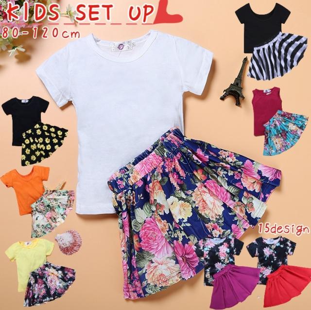 セットアップ 上下セット 子供服 Tシャツ 半袖 スカート タンクトップ キャミソール カットソー プルオーバー ミニ丈 花柄