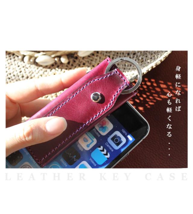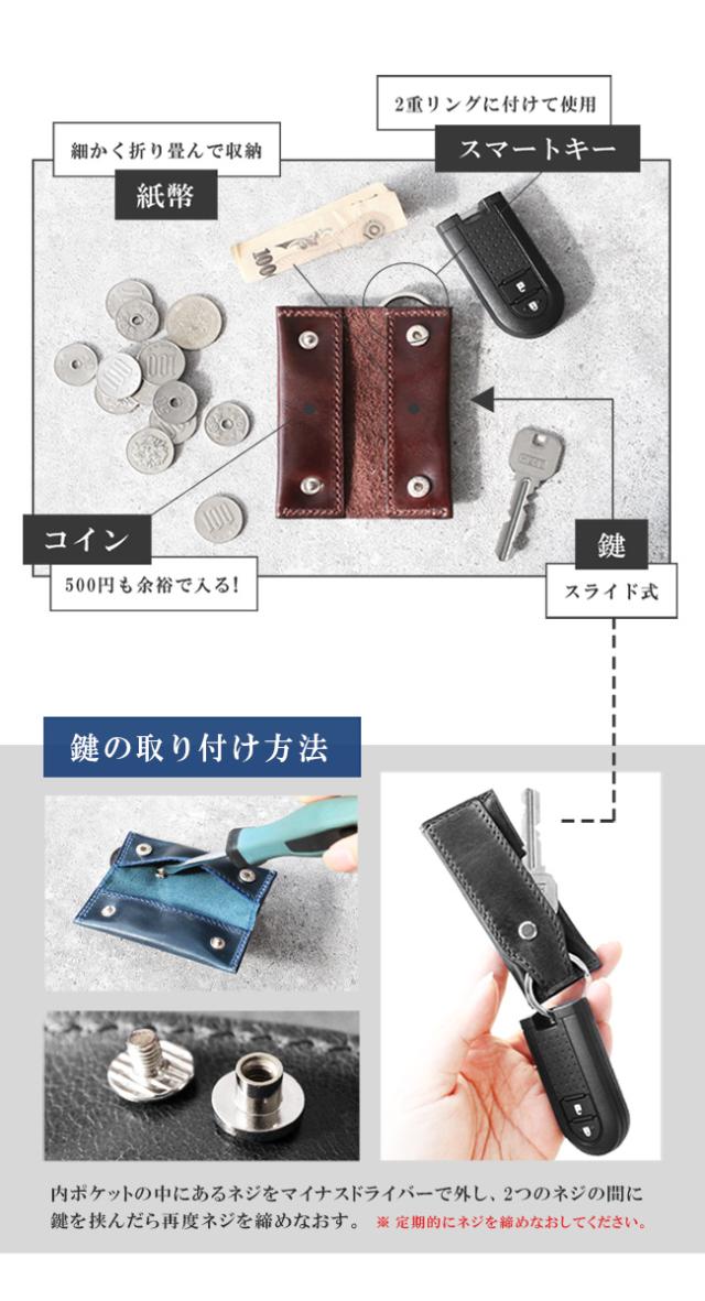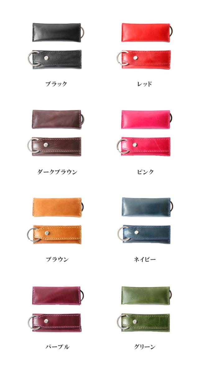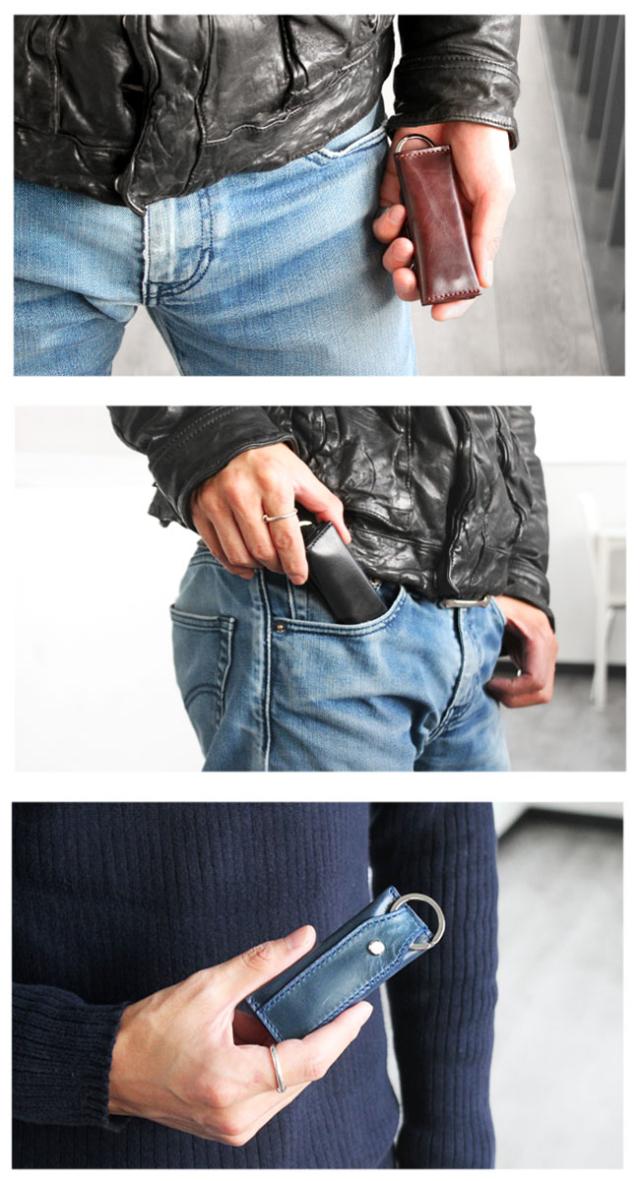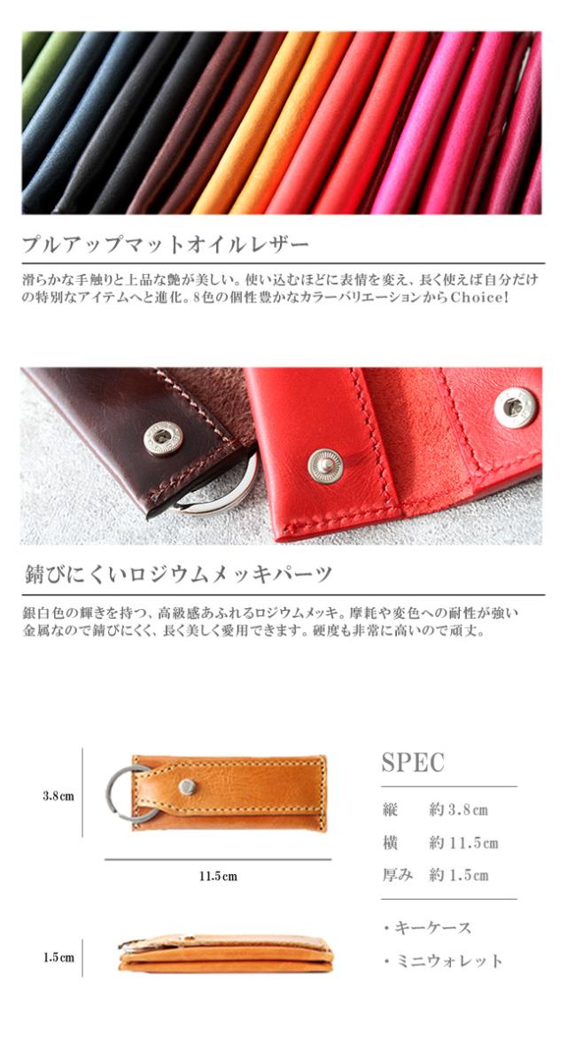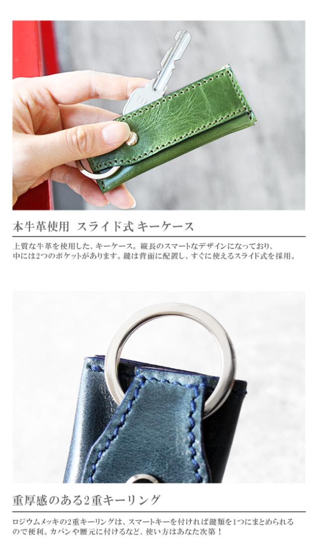 イタリアンプルアップオイルレザーを使用した本革仕様のキーケースです。滑らかな手触りと上品な艶が美しく、渋みのあって鮮やかな8色のカラーバリエーションからお選びいただけます。縦長のスマートなデザインになっており、中には2つのポケットがあるので小銭やお札を折って収納することができます。上部にはキーリングが付いており、ビスに鍵を取り付ける留め具はスライド式の鍵収納として使用できます。最低限の物を持ち歩くのに適したキーケースになっています。