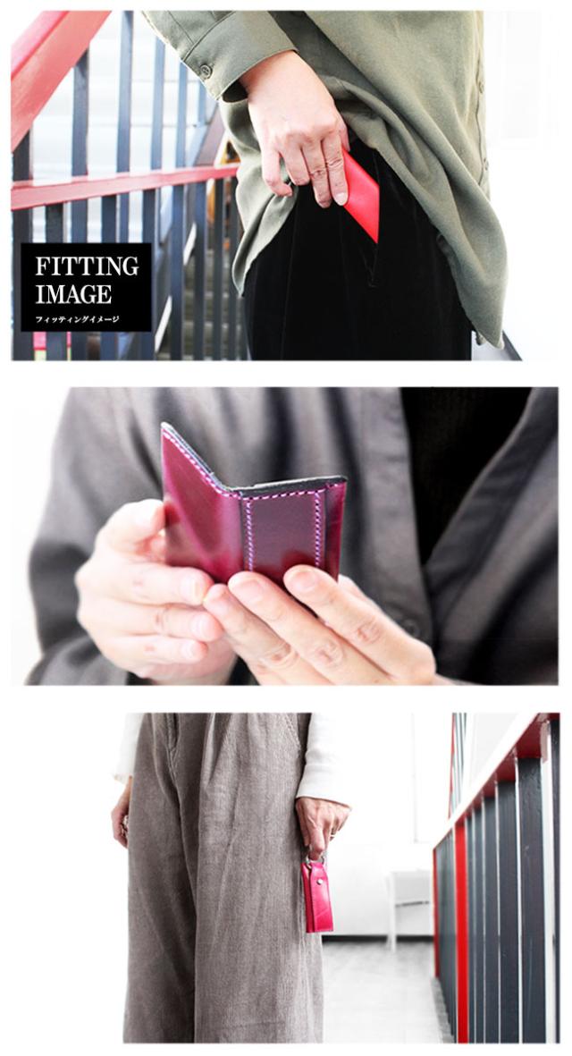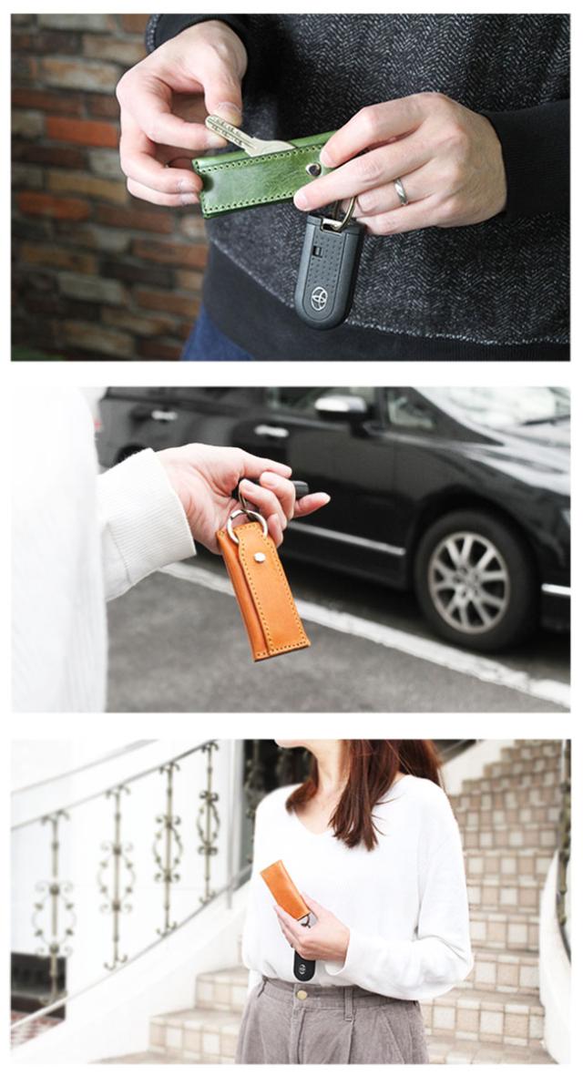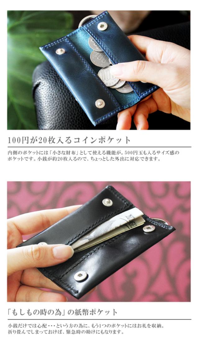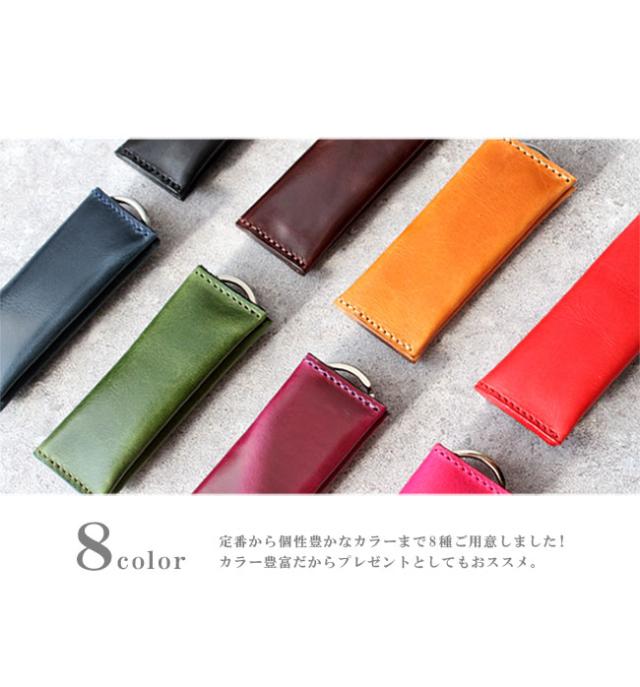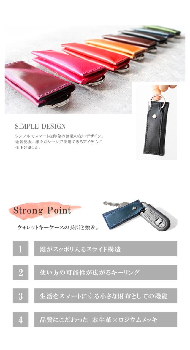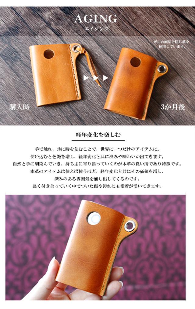 イタリアンプルアップオイルレザーを使用した本革仕様のキーケースです。滑らかな手触りと上品な艶が美しく、渋みのあって鮮やかな8色のカラーバリエーションからお選びいただけます。縦長のスマートなデザインになっており、中には2つのポケットがあるので小銭やお札を折って収納することができます。上部にはキーリングが付いており、ビスに鍵を取り付ける留め具はスライド式の鍵収納として使用できます。最低限の物を持ち歩くのに適したキーケースになっています。