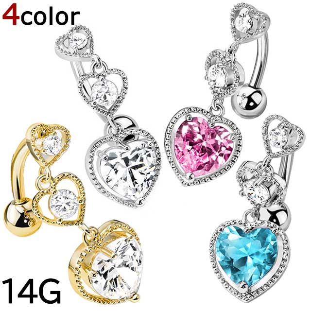 HSP CZ トリプルハートジュエル トップダウン 316Lサージカルステンレス バナナバーベル 14G 【 シルバー イエローゴールド ピンク ブルー クリア ゴージャス へそピアス ヘソピアス 】