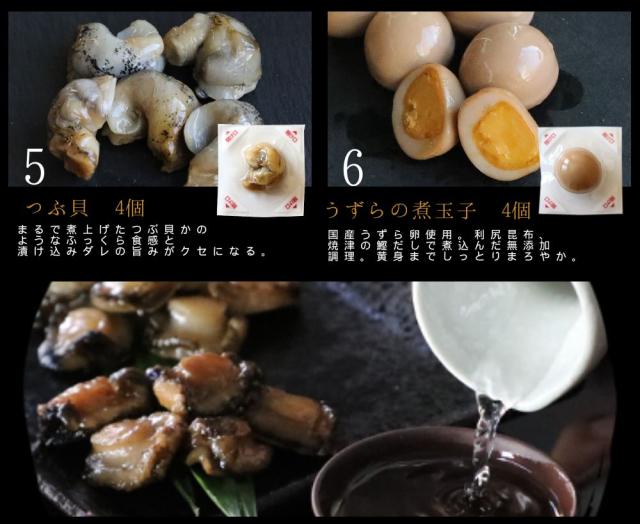 | 内 容 量 | ・おつまみあわび×4粒(あわび(セネガル産)、還元水飴、砂糖、食塩、加工澱粉、調味料(アミノ酸等)、リン酸塩(Na)) ・貝柱×4粒(イタヤ貝(中国産)、還元水飴、砂糖、食塩、調味料(アミノ酸等)、pH調整剤) ・ムール貝×4粒(ムール貝(チリ産)、しょうゆ、還元水飴、調味料(アミノ酸等)、pH調整剤) ・つぶ貝×4粒(つぶ貝(アイルランド産)、還元水飴、砂糖、食塩、加工澱粉、調味料(アミノ酸等)、リン酸塩(Na)) ・北海タコ×4粒(たこ(国産)、しょうゆ(小麦・大豆を含む)、還元水飴、砂糖/加工澱粉、調味料(アミノ酸等)、リン酸塩(Na)) ・うずら卵×4粒(うずら卵(国産)、還元水飴、しょうゆ、昆布だし、魚介エキス、かつおだし、砂糖、酵母エキス) |