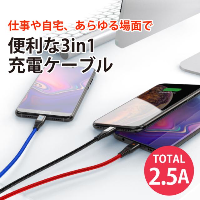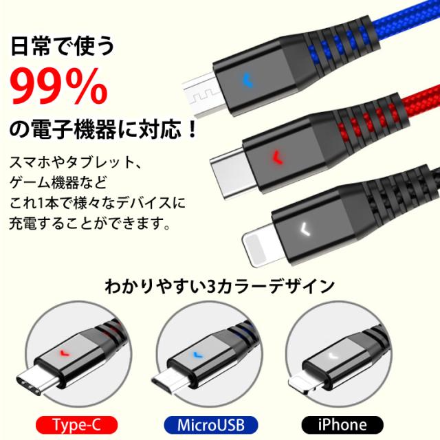 3in1ケーブル 充電器 iPhoneケーブル iphone11 iphone 充電器ケーブル iPad充電器 長さ 1.2m 2miOS Type-Cケーブル microusb typec スマホ 充電ケーブル iPhone Android Xperia AQUOS arrows Galaxy HUAWEI 充電 3本 アンドロイド 充電器