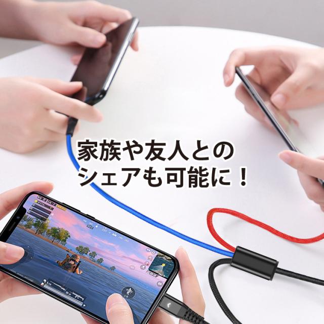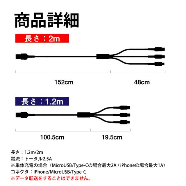 スマホ、タブレット、充電器など、3種同時に充電できるマルチケーブル