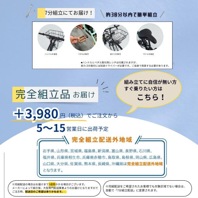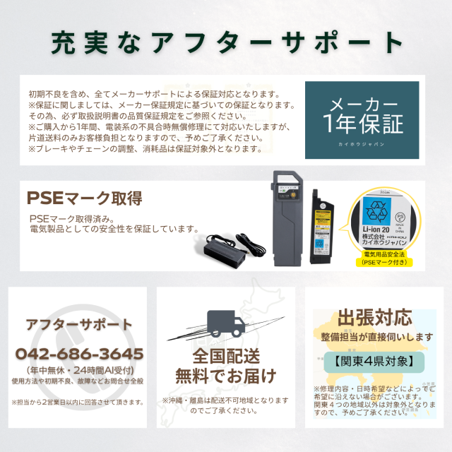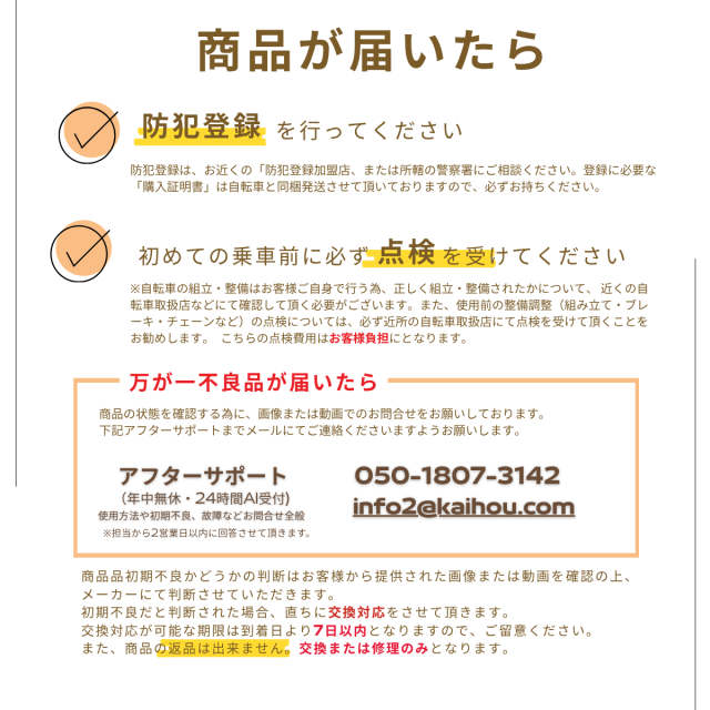 【初期不良・返品について】 出荷完了後の返品はお受付出来かねますので、予めご了承ください。 初期不良を含め全てメーカーサポートによる保証対応となります。 ■カイホウジャパンサポートセンター 電話番号:042-686-3645(24時間AIによる受付) 【自転車の初期整備・点検について】 本製品を受け取ったら、お客様自身で下記の組立作業を行う必要がございますので、必ずご確認ください。 ・ハンドルの取付け(ハンドルは取り外された状態でのお届けとなります) ・本体の組立 ・ペダルの取付け ※必要な組立道具は同梱させて頂いておりますので、取扱説明書をご確認上、作業を行ってください。 ※空気入れは必要に応じてお客様ご自身でお願いいたします。 【自転車取扱店などにて整備士による整備点検を受けてください】 メーカー直送品の場合、自転車の組立・整備はお客様ご自身で行う為、正しく組立・整備されたかについて、 近くの自転車取扱店などにて確認して頂く必要がございます。 大変お手数をお掛け致しますが、使用前の整備調整(組み立て・ブレーキ・チェーンなど)の点検については、 下記防犯登録手続きの際に、必ず近所の自転車取扱店にて点検を受けて頂くことをお勧めします。 【防犯登録手続きは近所の自転車取扱店にてお願いします】 ・購入した自転車車体 ・お買い上げ明細書(購入証明書) ・購入者の身分証明書 ・防犯登録に必要な費用(1000円未満) 【その他】 メーカー直送品の為、代引き決済が出来かねます。 |