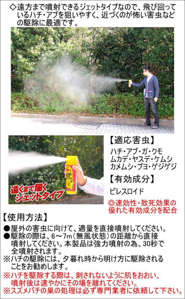| 使用方法 | 屋外の害虫に向けて適量を直接噴射して下さい。 駆除の際は、6m〜7m(無風状態)の距離から直接噴射して下さい。 本製品は強力噴射のため約30秒で全噴射されます。 ※ハチの駆除には夕暮れ時から明け方に駆除される事をお薦めします。 |