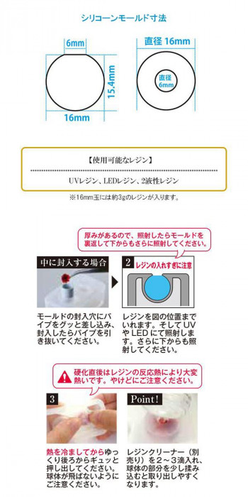 | 極限まで球体に近い、より伸びるシリコーン素材を使用しているので球体がスルッと取り出せます。1個のモールドで16mmの球体を2個作ることができます!!10mmのパーツが封入できるパイプ付き。 ★一体型なのでスジが入らない美しい球体ができる。 ★よく伸びる特殊シリコーンで、取り出しやすい。 ★付属のパイプ(内径10mm)を使用で、封入しやすい。 |