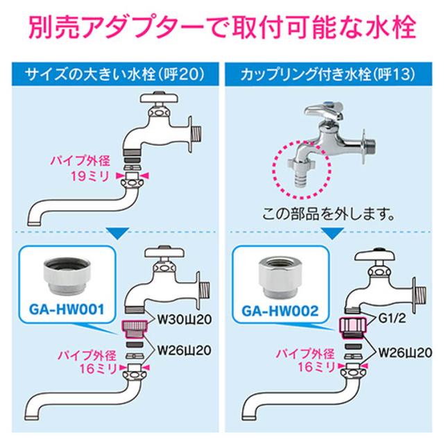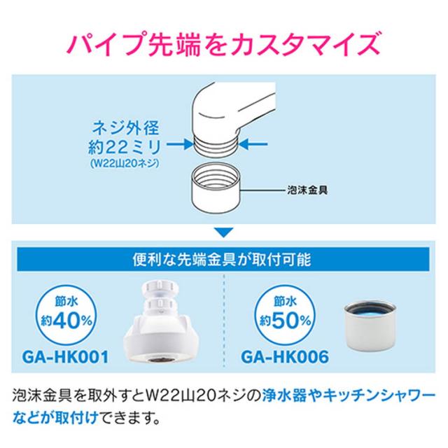 ●自由に曲げることのできる、長さ400ミリのラセン状パイプ。●用途に合わせてパイプを曲げて吐水位置を動かすことができ、使いやすさがアップします。●上向き・下向きどちらの蛇口にも使用できます。●泡沫金具が付いているので、節水器具未使用の場合と比べて約30%の節水効果(同メーカー比)があり、毎日の生活で節水を意識せずに節約できます。●使用中のパイプ外径が16ミリであればどんな蛇口にも取付けできます。