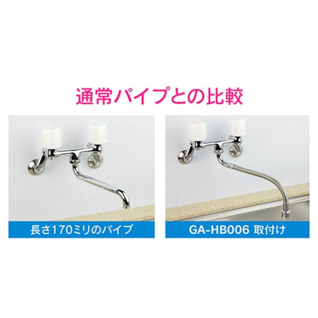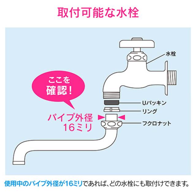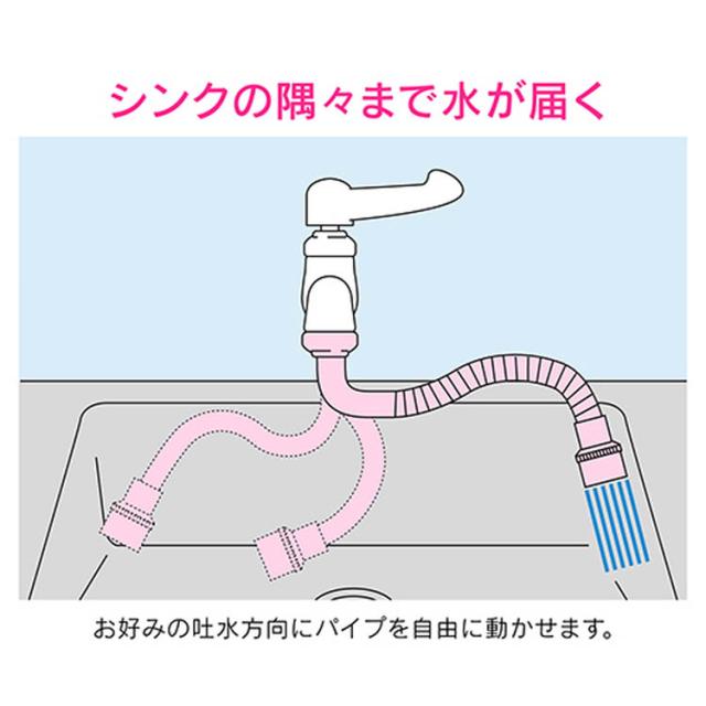 ●自由に曲げることのできる、長さ300ミリのラセン状パイプ。●用途に合わせてパイプを曲げて吐水位置を動かすことができ、使いやすさがアップします。●上向き・下向きどちらの蛇口にも使用できます。●泡沫金具が付いているので、節水器具未使用の場合と比べて約30%の節水効果(同メーカー比)があり、毎日の生活で節水を意識せずに節約できます。●使用中のパイプ外径が16ミリであればどんな蛇口にも取付けできます。