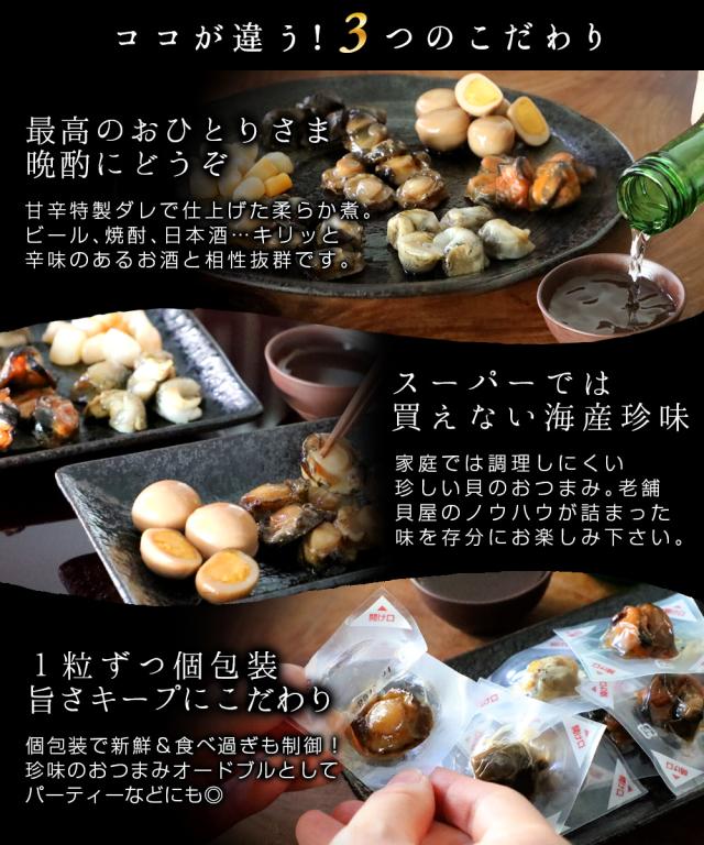 | 内 容 量 | ・おつまみあわび×6粒(あわび(セネガル産)、還元水飴、砂糖、食塩、加工澱粉、調味料(アミノ酸等)、リン酸塩(Na)) ・貝柱×6粒(イタヤ貝(中国産)、還元水飴、砂糖、食塩、調味料(アミノ酸等)、pH調整剤) ・ムール貝×6粒(ムール貝(チリ産)、しょうゆ、還元水飴、調味料(アミノ酸等)、pH調整剤) ・つぶ貝×6粒(つぶ貝(アイルランド産)、還元水飴、砂糖、食塩、加工澱粉、調味料(アミノ酸等)、リン酸塩(Na)) ・北海タコ×6粒(たこ(国産)、しょうゆ(小麦・大豆を含む)、還元水飴、砂糖/加工澱粉、調味料(アミノ酸等)、リン酸塩(Na)) ・うずら卵×6粒(うずら卵(国産)、還元水飴、しょうゆ、昆布だし、魚介エキス、かつおだし、砂糖、酵母エキス) |