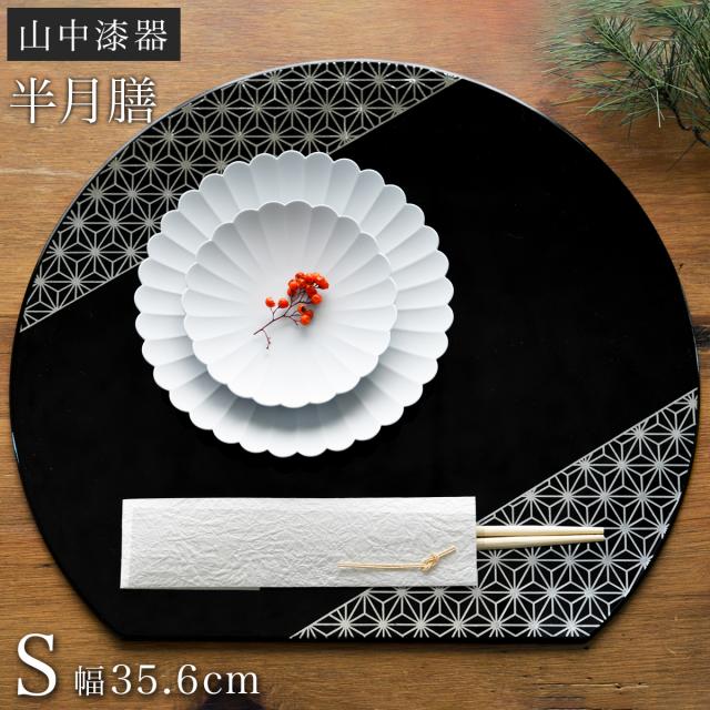テーブルコーディネートをワンランクアップさせてくれる半月盆(プレースマット/ランチョンマット)です。山中漆器の技術により本物の漆のような艶やかさ、上品さと、扱いやすさを兼ね備えています。お正月や年末年始のおせち、祝いの席の懐石料理やおもてなしにオススメです。麻の葉は魔除けや成長を願う意味が込められた吉祥模様です。