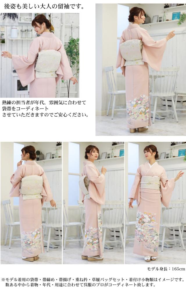 | ※モデル着用の袋帯・帯締め・帯揚げ・草履バッグ・小物類の色、デザインはイメージです。 数ある中から呉服のプロがコーディネートしてお届け致します。 | |||