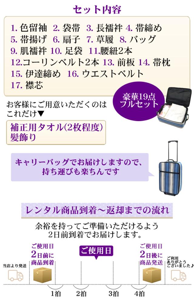 | 色留袖・袋帯・長襦袢・帯〆・帯揚げ・扇子・草履・バッグ・肌襦袢・足袋・腰紐2本 コーリンベルト2本・前板・帯枕・伊達締め・ウエストベルト・襟芯 | |||