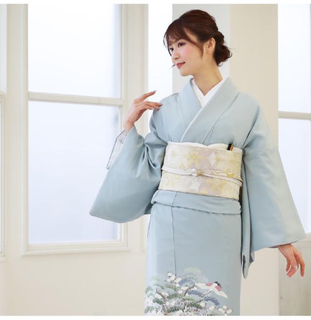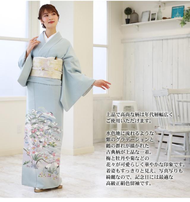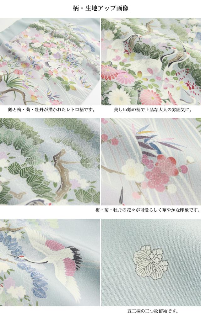 留袖 レンタル 正絹色留袖19点フルコーディネートレンタルフルセット「水色地に鶴と梅・菊・牡丹」色留袖 三つ紋 結婚式 披露宴 レンタル 安い レトロ モダン