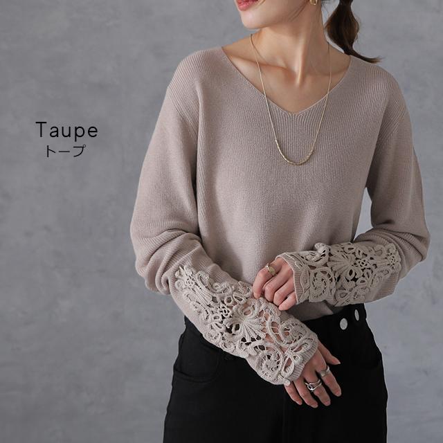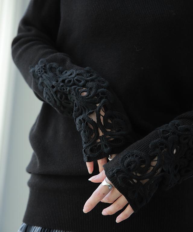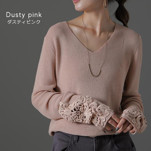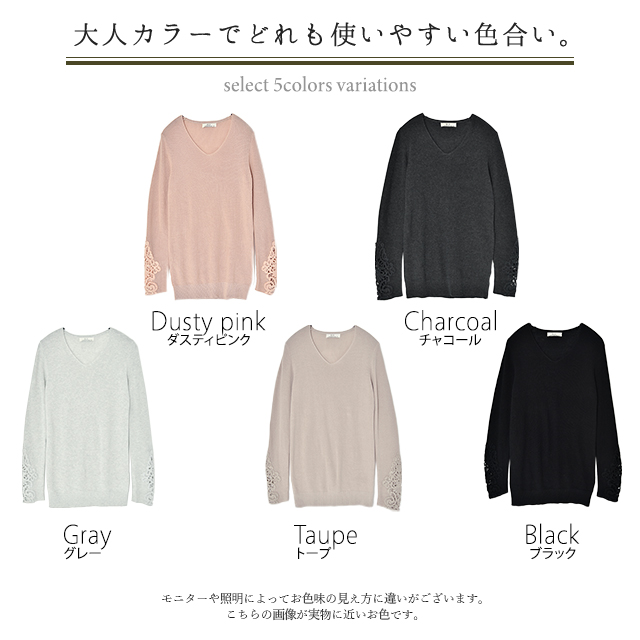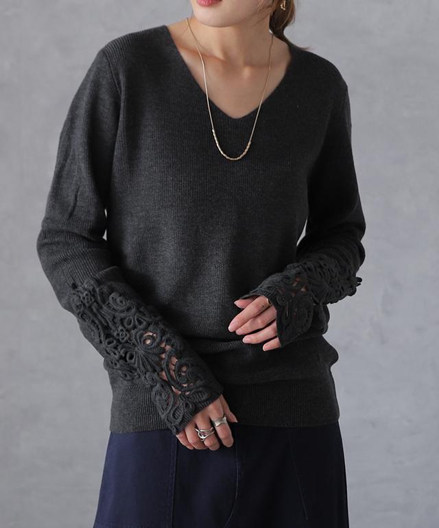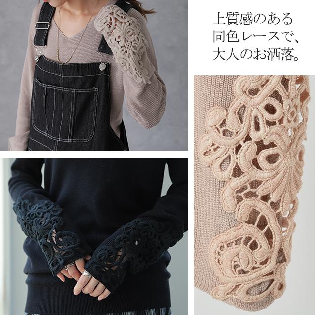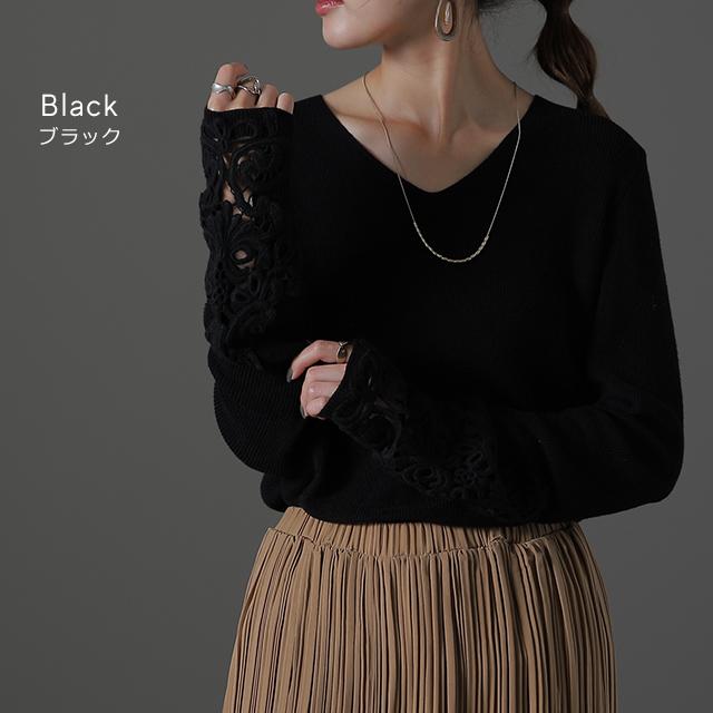 ニット 「 華やかさ、プラス 」 袖レース レディース トップス レース セーター プルオーバー チュニック Vネック ハイゲージ 無地 きれいめ お尻が隠れる 長袖 透け 花柄 ストレッチ 薄手 ゆる 長め リブ 大きいサイズ ブラック 秋新作