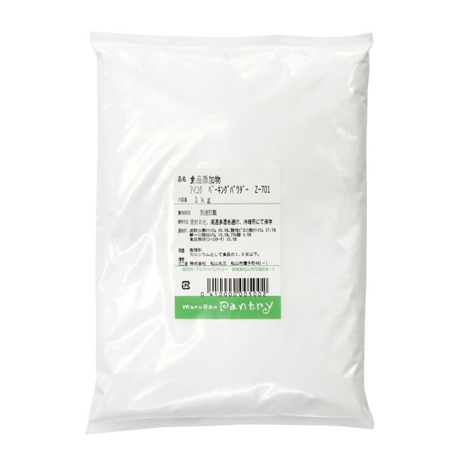 【原材料名】 炭酸水素ナトリウム35.0%、酸性ピロリン酸ナトリウム27.0%、第一リン酸カルシウム15.0%、フマル酸0.5%、食品素材(コーンスターチ)22.5%