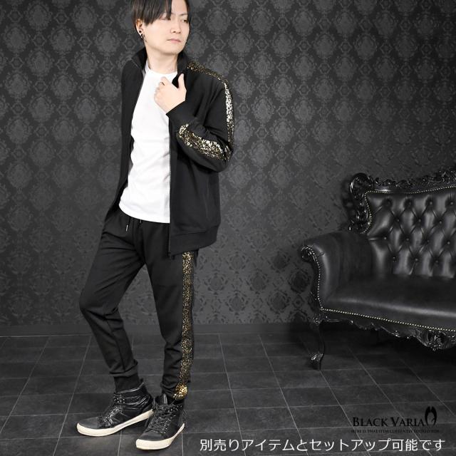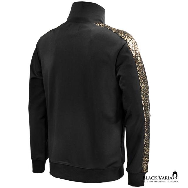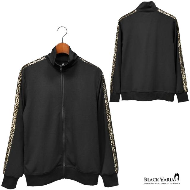 トラックジャケット サイドライン ヒョウ柄 箔プリント メンズ レオパード ストレッチ フルジップアップ 長袖 mens(ブラック黒) 94347