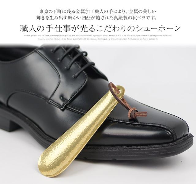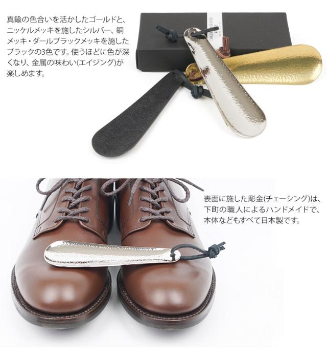 東京の下町に残る金属加工職人の手により、金属の美しい輝きを生み出す細かい凹凸が施された真鍮製の靴ベラです。