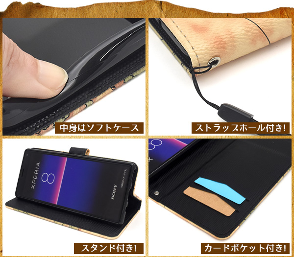 スマホケース 手帳型 Xperia 8 SOV42 Y!mobile UQmobile用 ワールドマップデザイン手帳型ケース 世界地図 横開き スマホカバー 保護ケース uqモバイル ワイモバイル エクスぺリア8 xperia8 ベージュ 合皮 レザーケース かわいい レトロ 地図柄