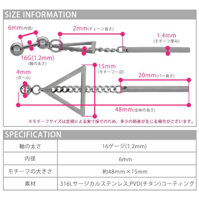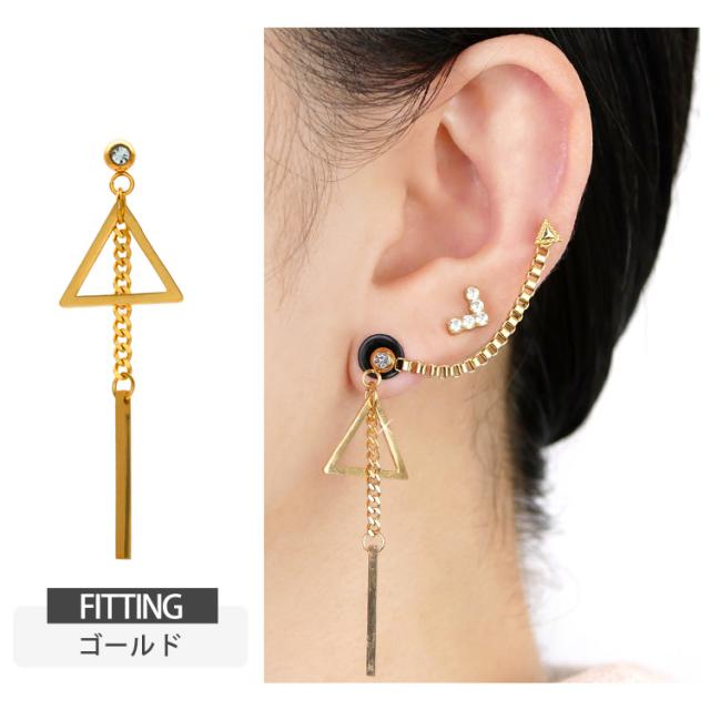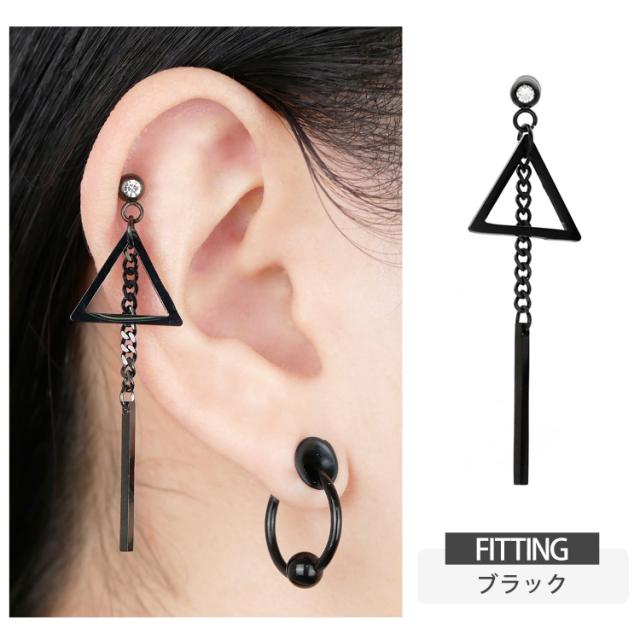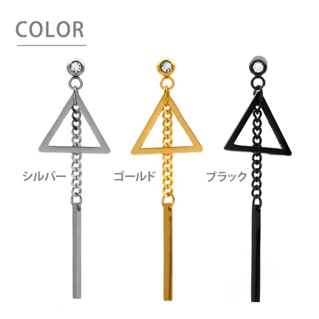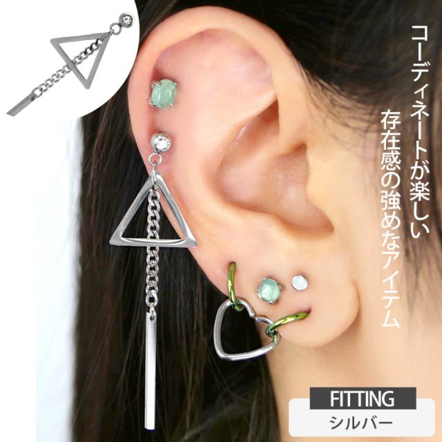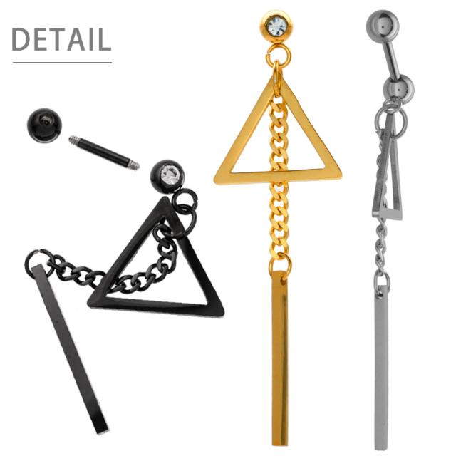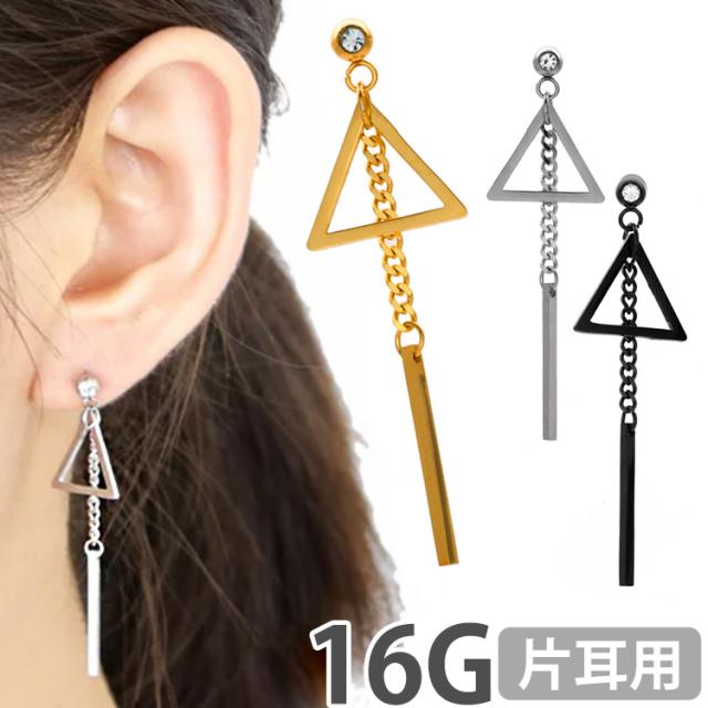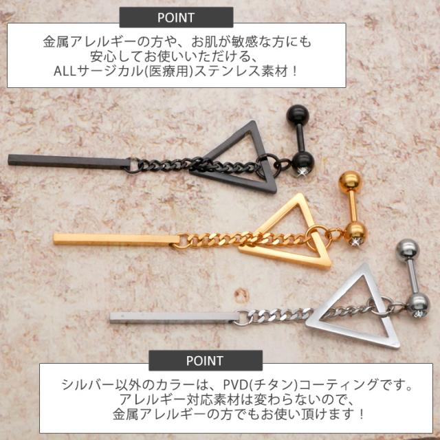 耳元で揺れて存在感アリのピアス。軽くて長時間つけても痛くありません。トライアングルがモードに決まります!光を反射して煌めきます☆太さはボディピアスのスタンダードサイズの16G。アレルギーが起きにくいサージカル(医療用)素材なのでどんな時でも安心です。
