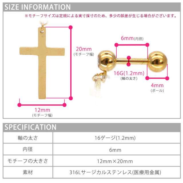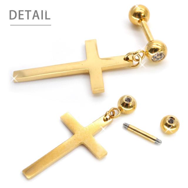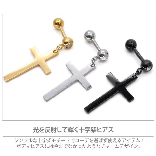 光を反射して輝く十字架ピアス シンプルな十字架モチーフでコーデを選ばず使えるアイテム!ボディピアスには今までなかったようなチャームデザイン。太さはボディピアスのスタンダードサイズの16G。アレルギーが起きにくいサージカル(医療用)素材なのでどんな時でも安心です。