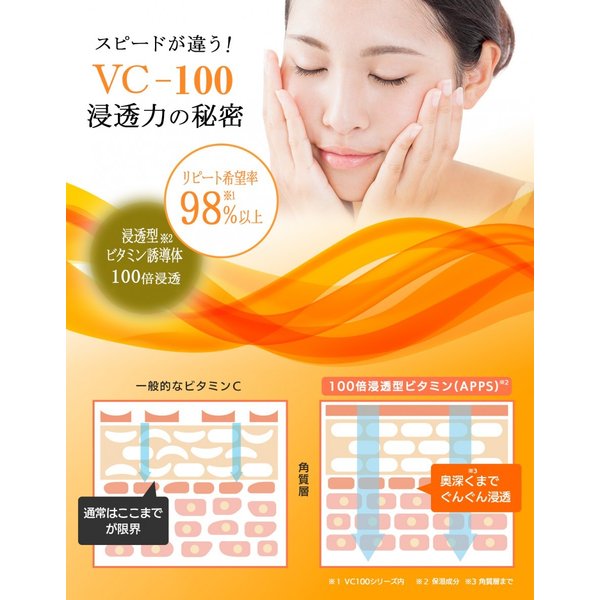 商品説明:100倍浸透型ビタミンC(APPS)誘導体の浸透力は今までのビタミンC誘導体の100倍ともいわれています。