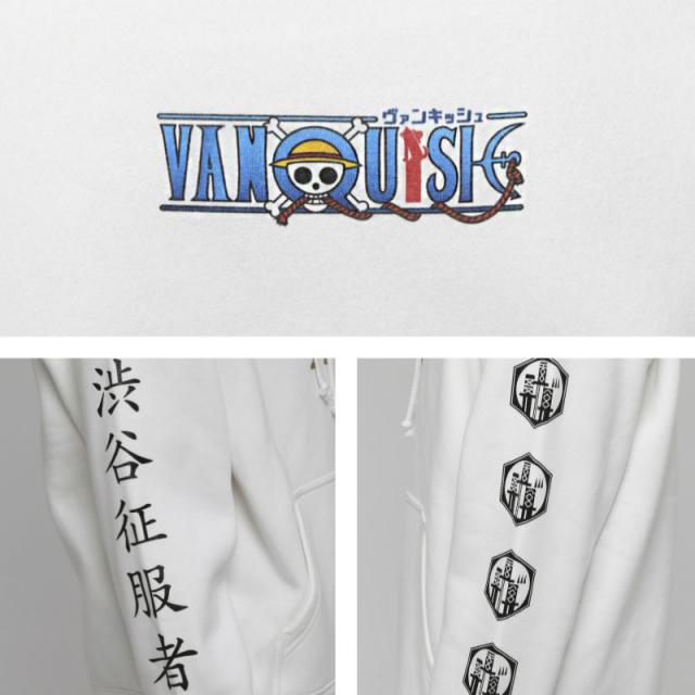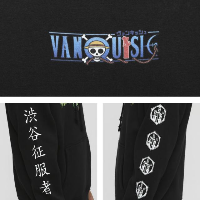 フードをあげると「VANQUISH」をONE PIECEのロゴでプリントし、コラボレーションならではのデザインもポイント。