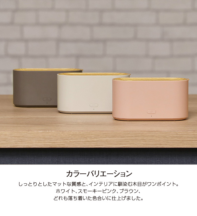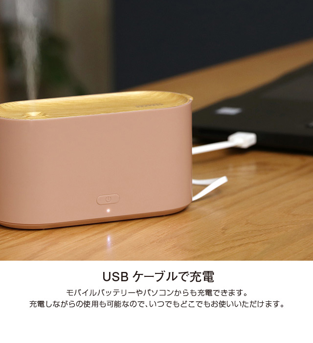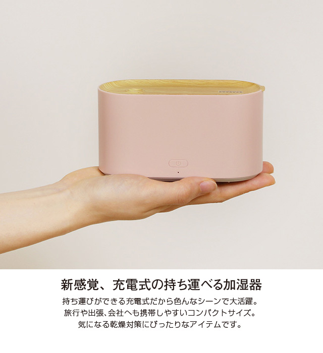 ワイヤレスで持ち運んで使える充電式加湿器。旅行などのお出掛けからオフィスのデスク回りなどのさまざまなシーンで活躍。加湿器を持ち運ぶという新しいスタイルの提案です。