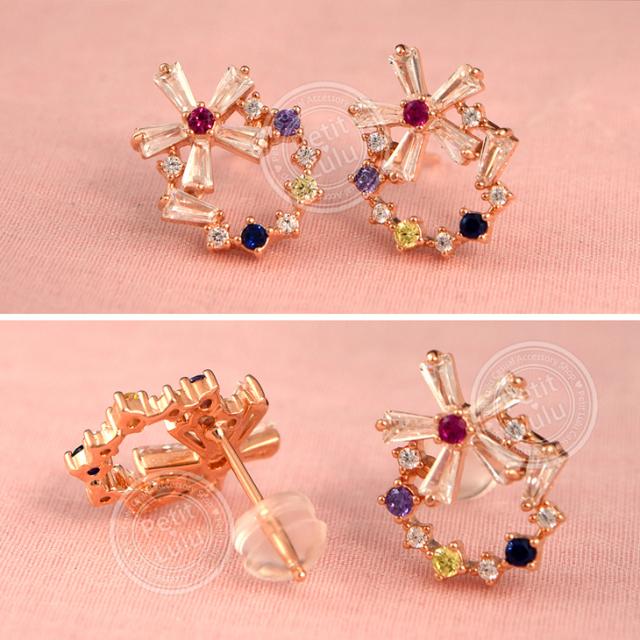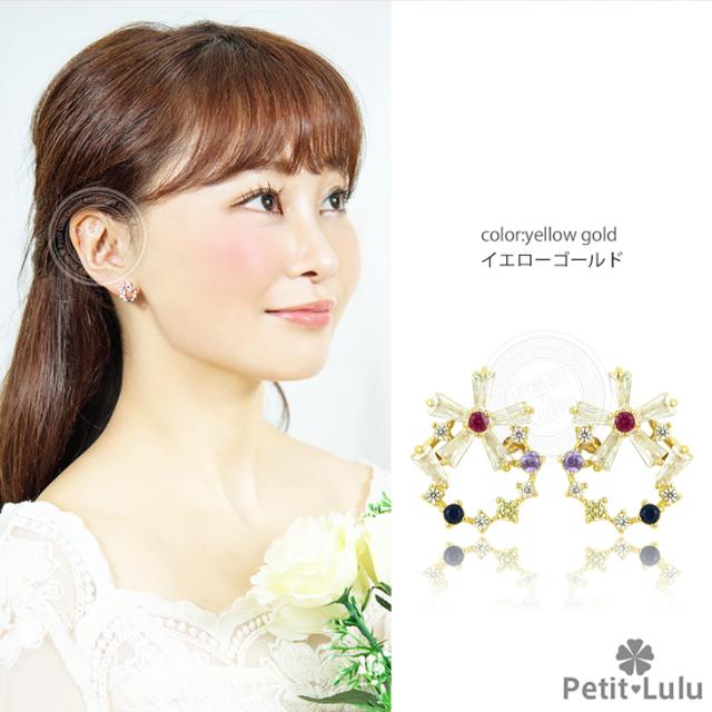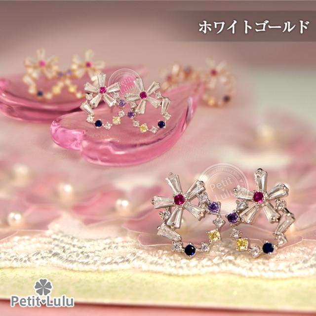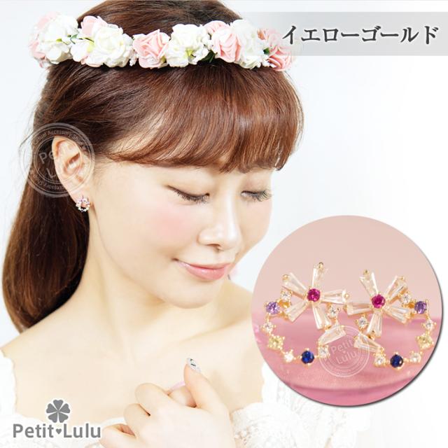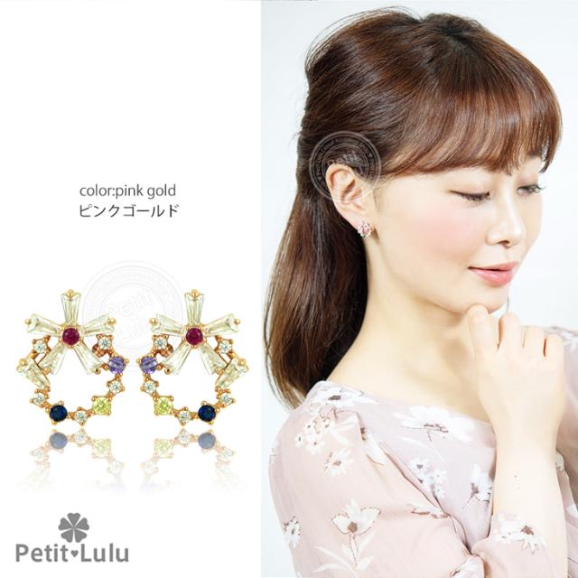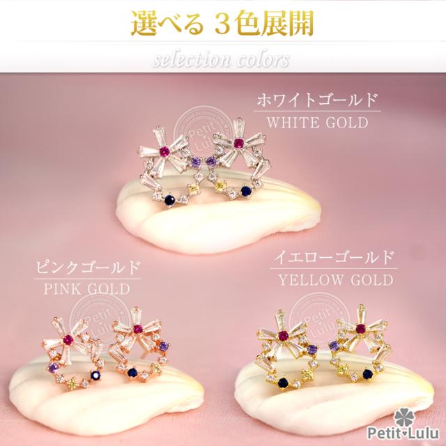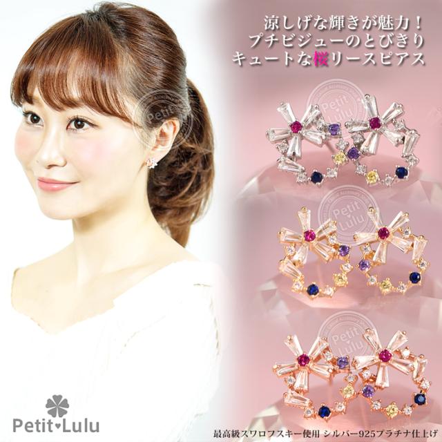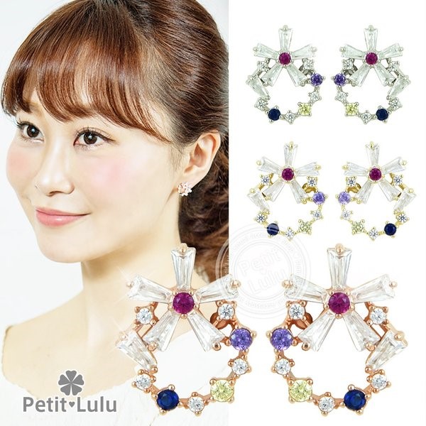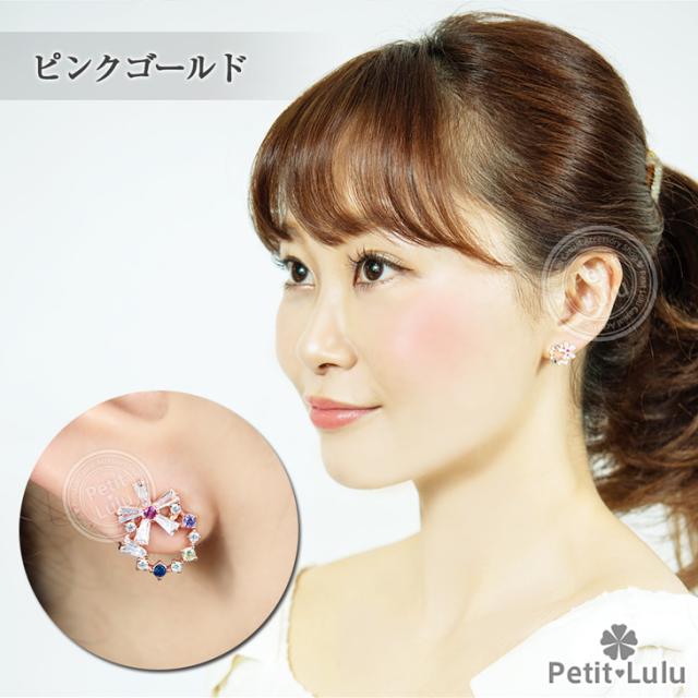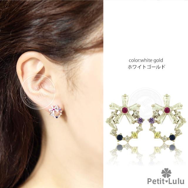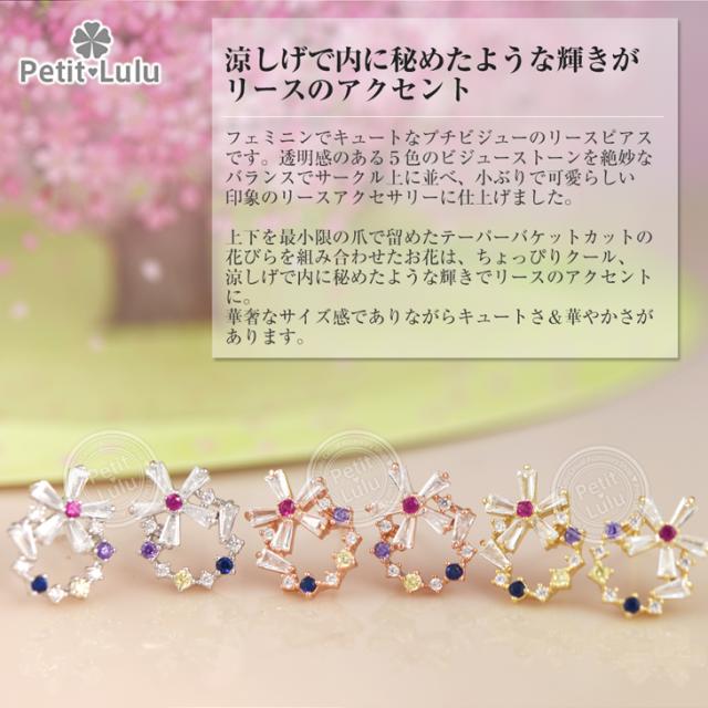 フェミニンでキュートなプチビジューのリースピアスです。透明感のある5色のビジューストーンを絶妙なバランスでサークル上に並べ、小ぶりで可愛らしい印象のリースアクセサリーに仕上げました。上下を最小限の爪で留めたテーパーバケットカットの花びらを組み合わせたお花は、ちょっぴりクール、涼しげで内に秘めたような輝きでリースのアクセントに。華奢なサイズ感でありながらキュートさ&華やかさがあります。あらゆるシーン、ファッションにコーディネートでき、オールシーズンOKのおススメピアス。繊細な素材を使用しているので、十分高見えするシルバーアイテムです。【レビューお約束でかわいい巾着プレゼント中】金属アレルギーの方でも安心して身につけていただけます。【素 材】:キュービックジルコニア(ダイヤモンドCZ) シルバー925/プラチナ仕上げ【サイズ】:縦1.2cmx横1.4cm【数 量】:1ペア(2個)【カラー】:ピンクゴールド/ホワイトゴールド/イエローゴールド【刻 印】:silver925 刻印【付属品】:オリジナルジュエリーボックス 1個 かわいい巾着 1枚