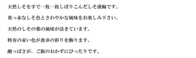 梅(和歌山県産)、しそ、漬け原材料(果糖ぶどう糖液糖、還元水飴、醸造酢、蜂蜜、鰹エキス)/酒精、調味料(アミノ酸等)、酸味料、甘味料(ステビア)、V.B1、ユッカ抽出物