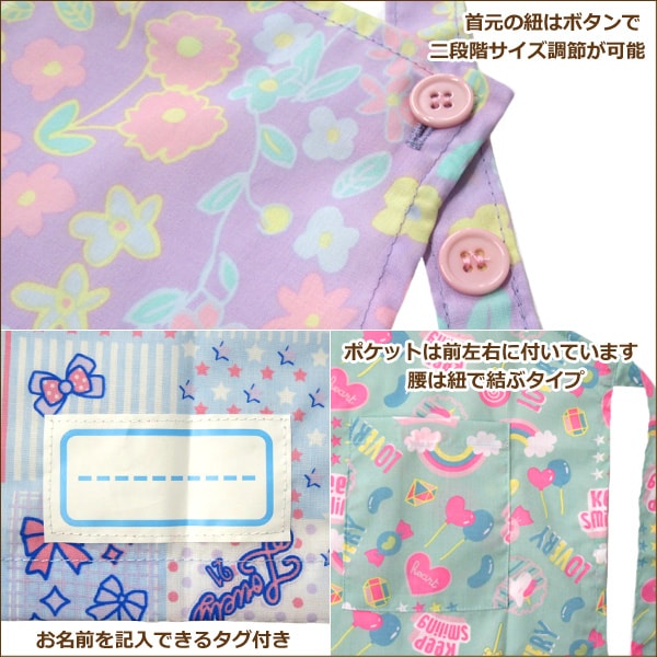 | 商品説明 | ※保育園・幼稚園・学校での給食当番や調理実習にはもちろん、おうちでの料理のお手伝いやイベントなどにも大活躍の子供用エプロン♪ ※首元の紐はボタンで二段階サイズ調節が可能!腰は紐で結ぶタイプです。 ※ポケットは前左右に付いています。 ※裾部分にはお名前を記入できるタグが付いています。 | |