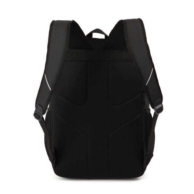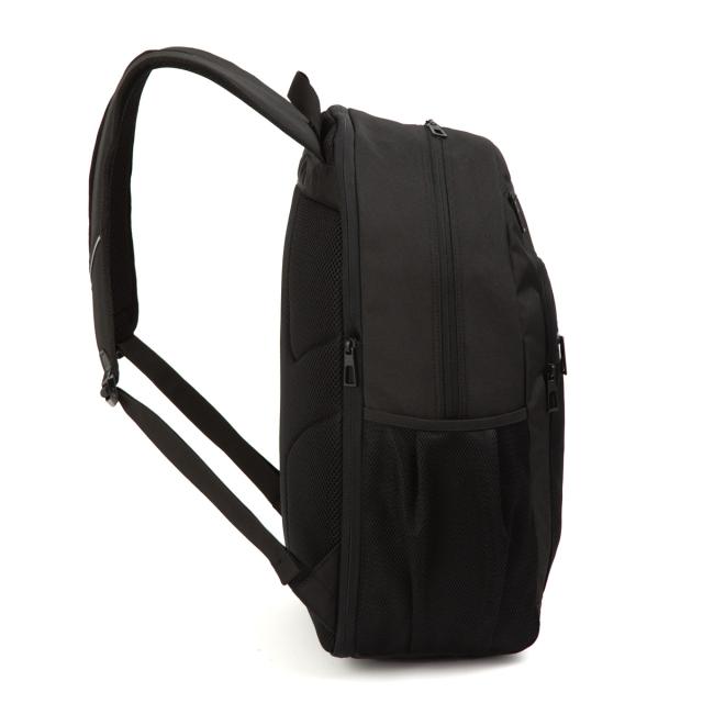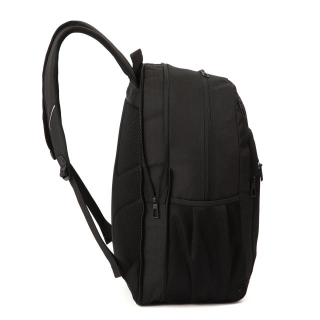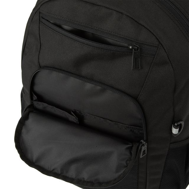 前面にはファスナーポケットが3つあり、小物の整理に役立ちます。側面にはメッシュポケットを装備しており、ペットボトルや折り畳み傘などの収納に便利です。