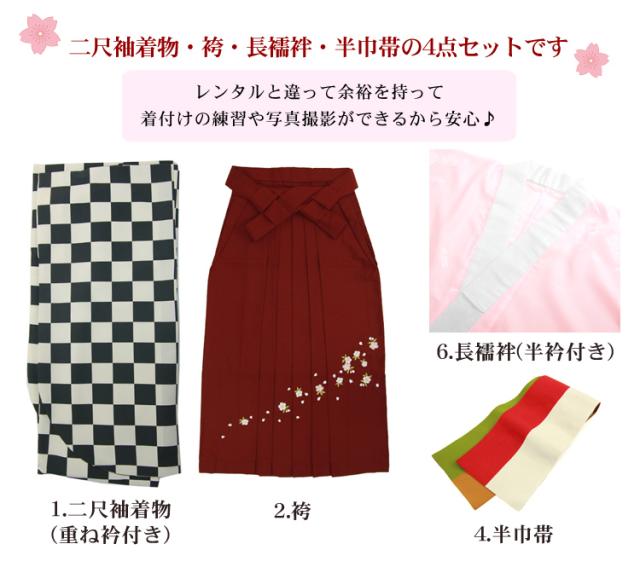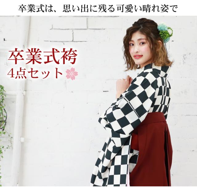 〔zu〕販売 袴 セット 卒業式 女性 4点フルセット 購入 卒業式袴セット 2尺袖着物&袴「黒・クリーム色の市松模様」レトロ 大学 販売 安い