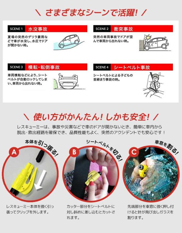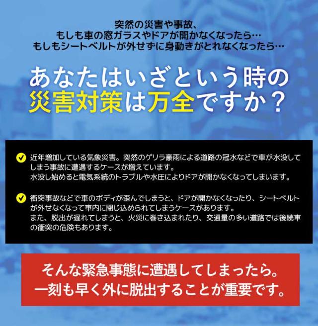 ゲリラ豪雨などでの水没事故、突然の車両事故、シートベルト事故対策に装備しておきたいアイテムです。