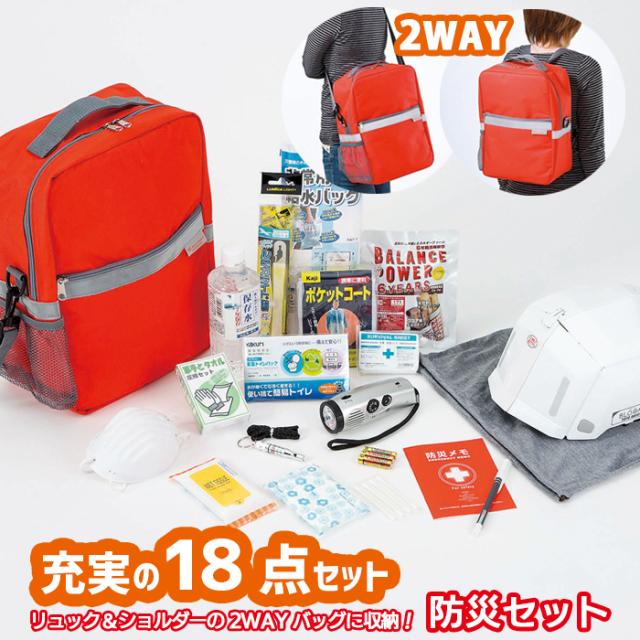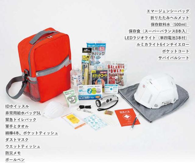 リュックやショルダーとして使用できるバッグに、避難時に必要なアイテムをセットした緊急避難、帰宅支援防災セット。