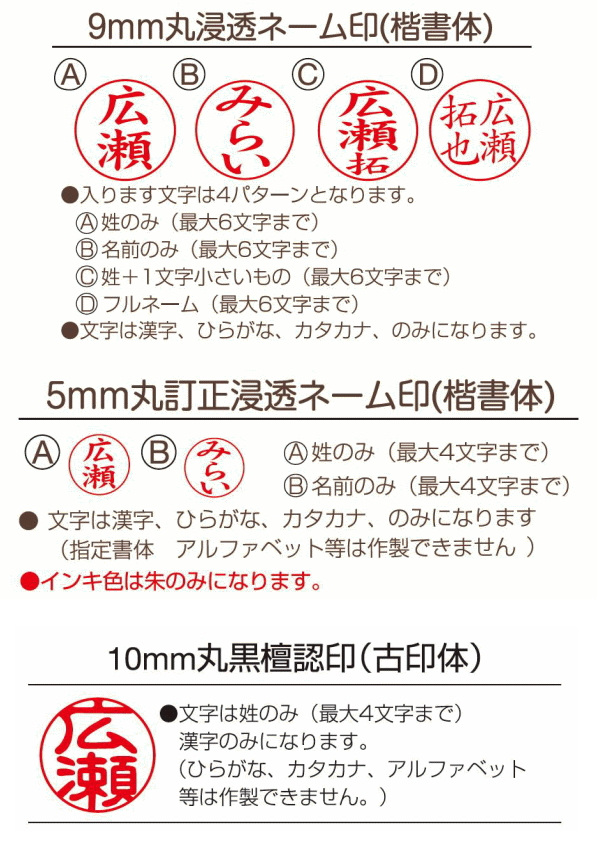 ■印面サイズ/(ネーム印 直径9ミリ)(黒檀認印 直径10ミリ)(訂正印 直径5ミリ)