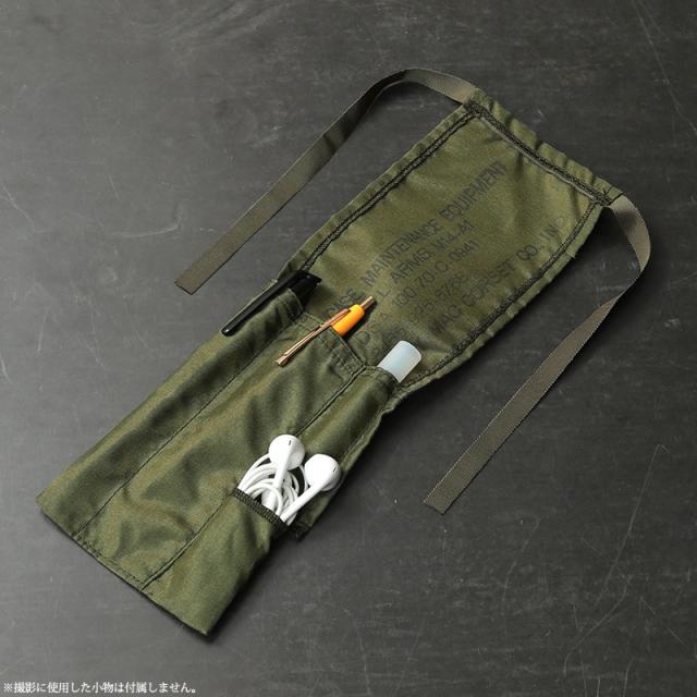 米軍のアサルトライフルM14用のクリーニングキットを収納するナイロン製ケース。ブラシやクリーニングロッドを収納するための小型のポーチで4ヶ所の収納部分と1ヶ所に樹脂製の筒が収納されており、背面にALICEクリップなどを装着しショルダーストラップやバッグ、MOLLEシステム対応のウェビングなどにも取付ける事ができます。フロントのUSロゴがさりげないミリタリー感。フラップの先端には紐が付属していますので本体を絞って固定することなどに使用します。普段使いの小物や、ペン、印鑑など収納するのに便利なアイテムです。