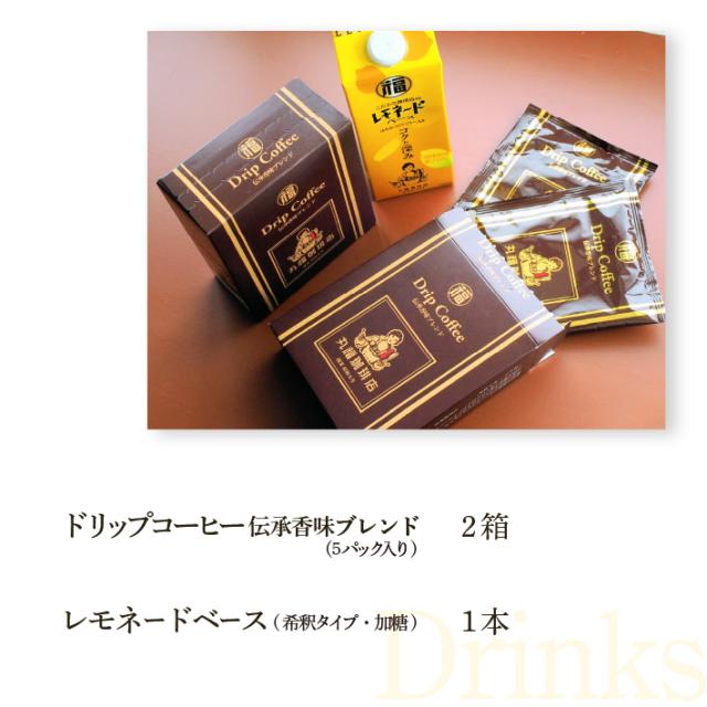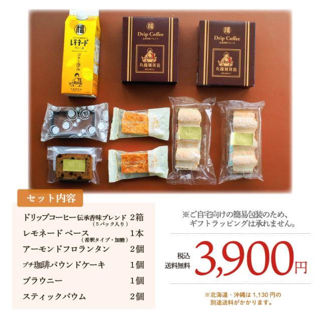ドリップ珈琲伝承香味ブレンド×2箱 レモネードベース×1本 アーモンドフロランタン×2個 プチ珈琲パウンドケーキ×1個 ブラウニー×1個 スティックバウム×2個 |